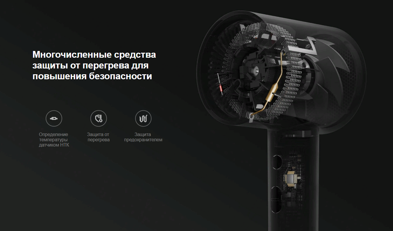 Датчик НТК определяет температуру выходящего воздуха в режиме реального времени. Отобранные высокоточные элементы могут автоматически активировать защиту от перегрева и отключать питание в случае превышения температурного порога. В крайних случаях для обеспечения безопасности срабатывает предохранитель.
