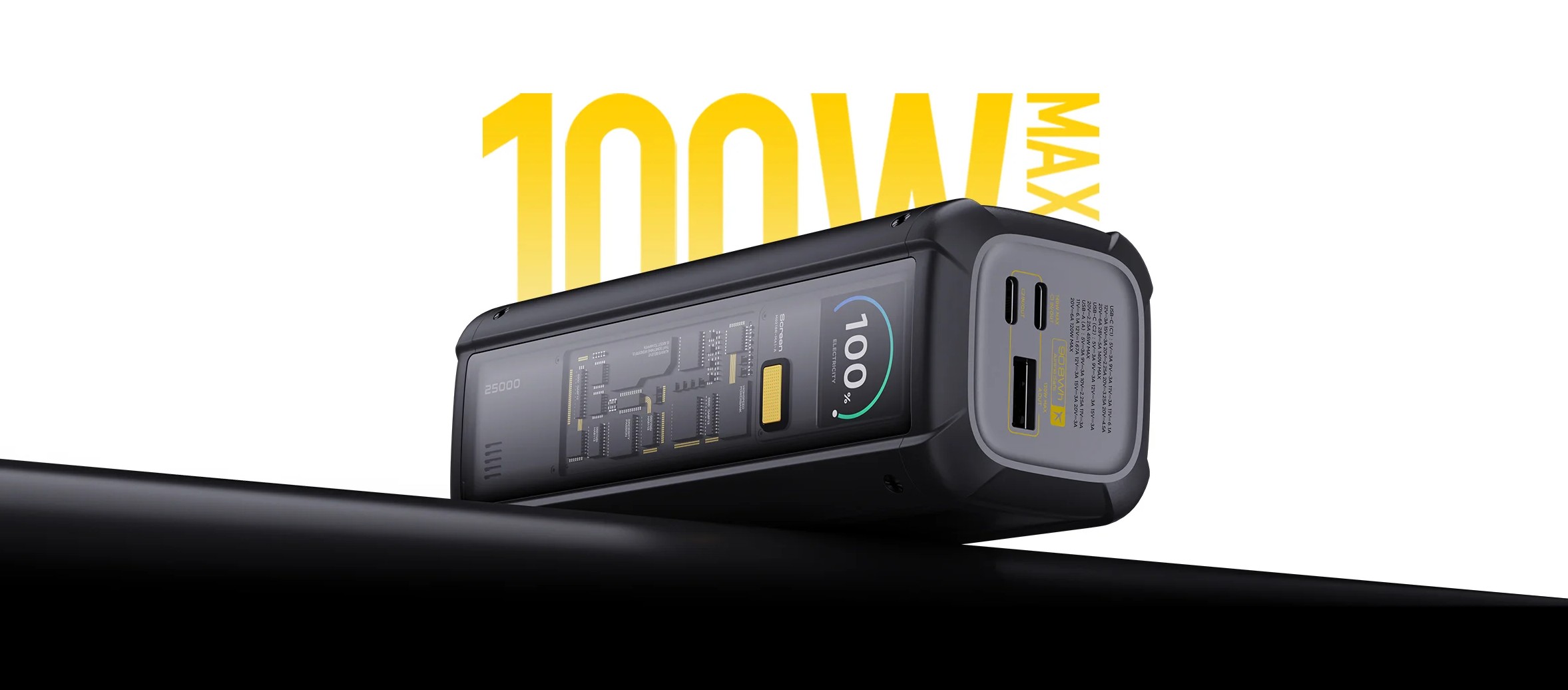 Этот пауэрбанк оснащен тремя портами, каждый из которых предназначен для разных устройств. Первый USB Type-C поддерживает мощность до 140 Вт и протокол Power Delivery 3.1, что позволяет быстро заряжать даже ноутбуки, такие как MacBook Pro. Второй USB Type-C обеспечивает мощность до 45 Вт для более компактных устройств, а порт USB Type-A выдаёт до 120 Вт, что делает пауэрбанк универсальным решением для зарядки целого спектра девайсов.