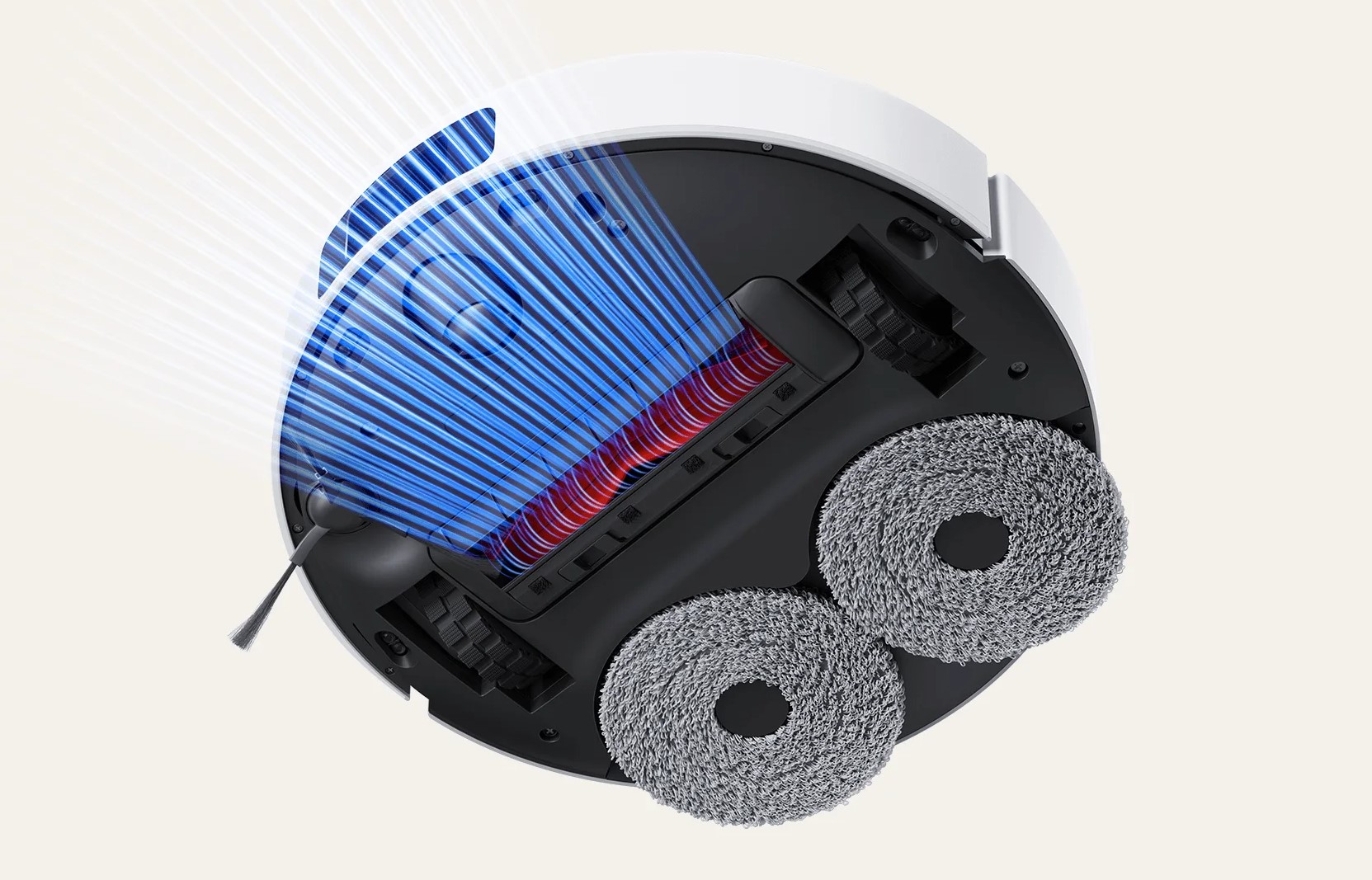 Робот-пылесос оснащен двумя швабрами для влажной уборки, которые вращаются с высокой скоростью во время уборки и плотно прилегает друг к другу, что обеспечивает более эффективную очистку пятен на полу.